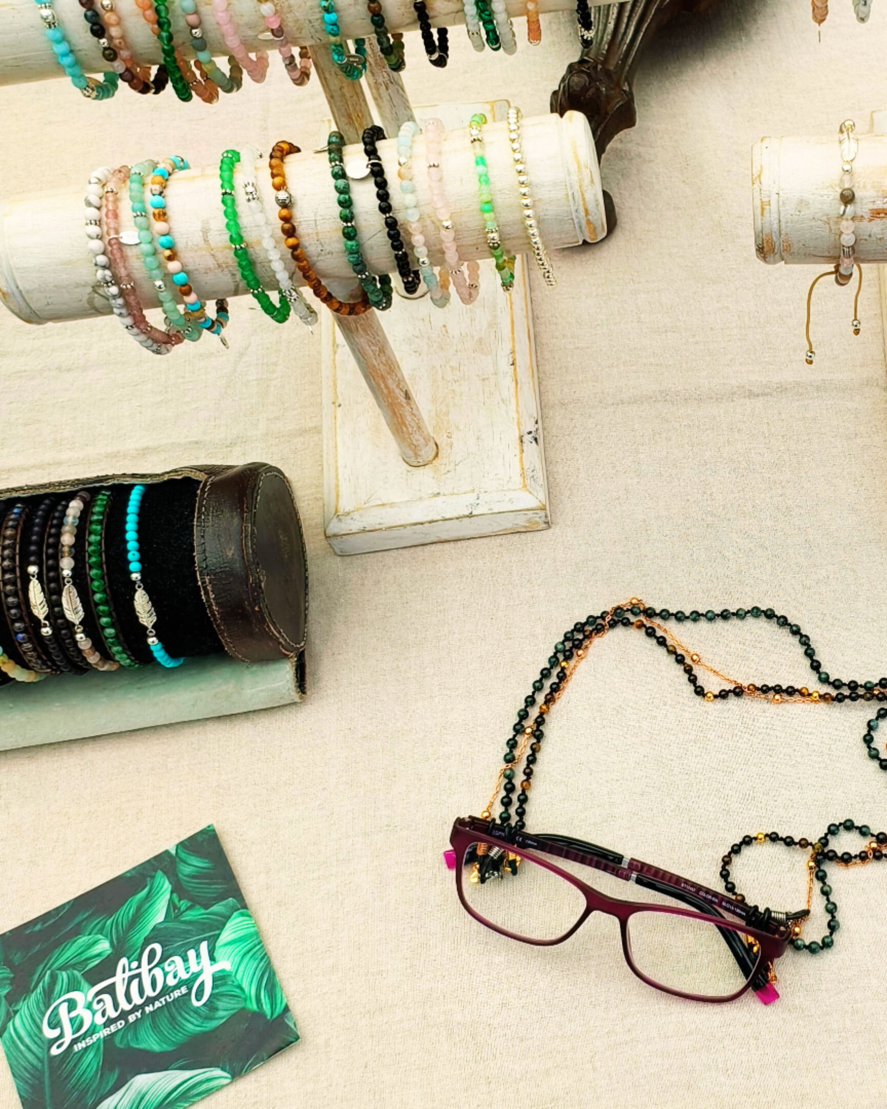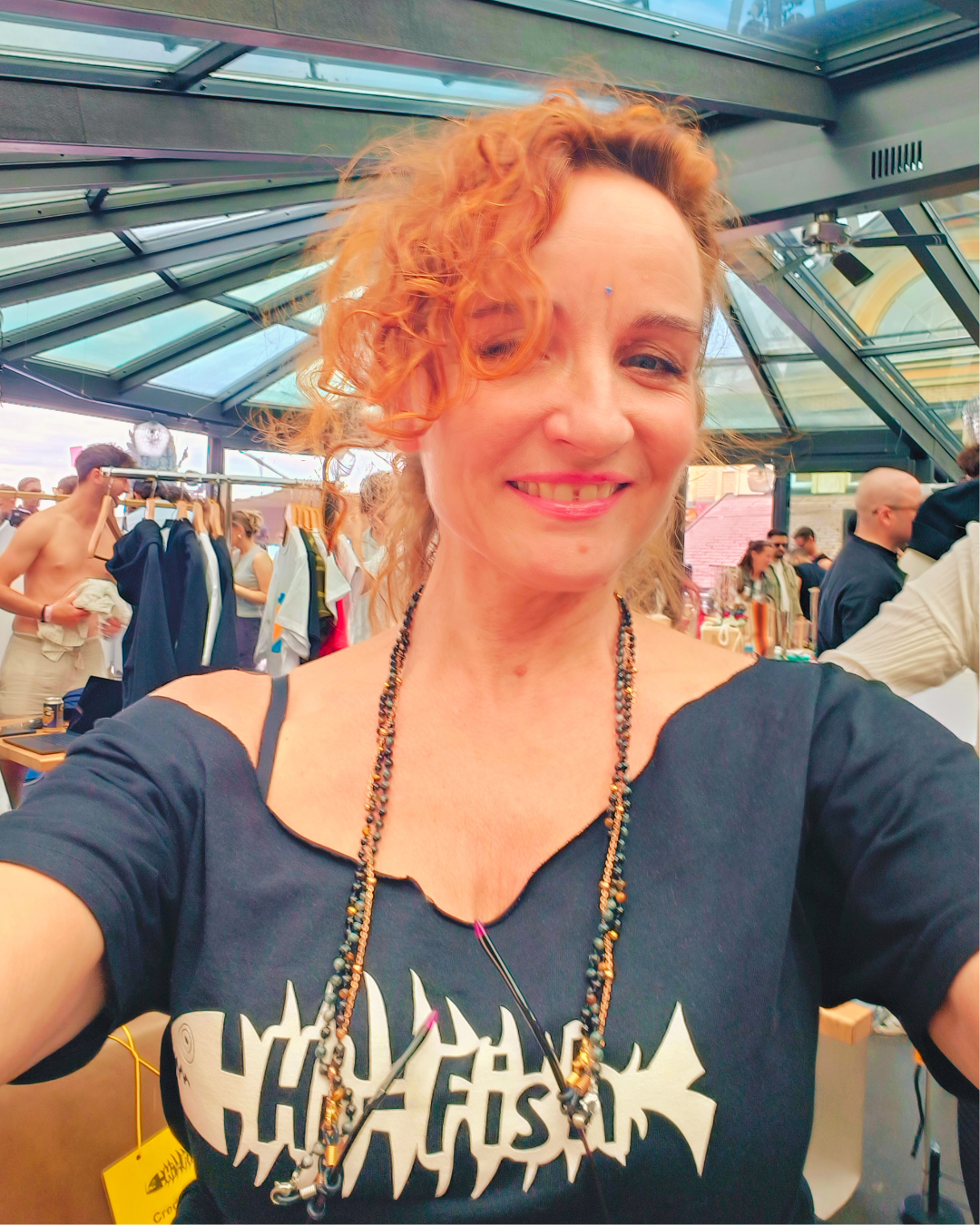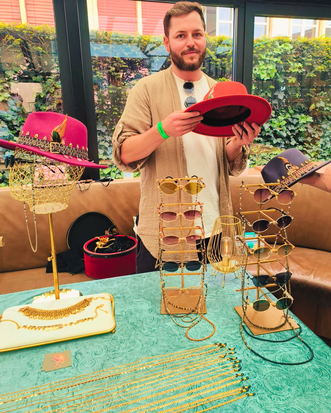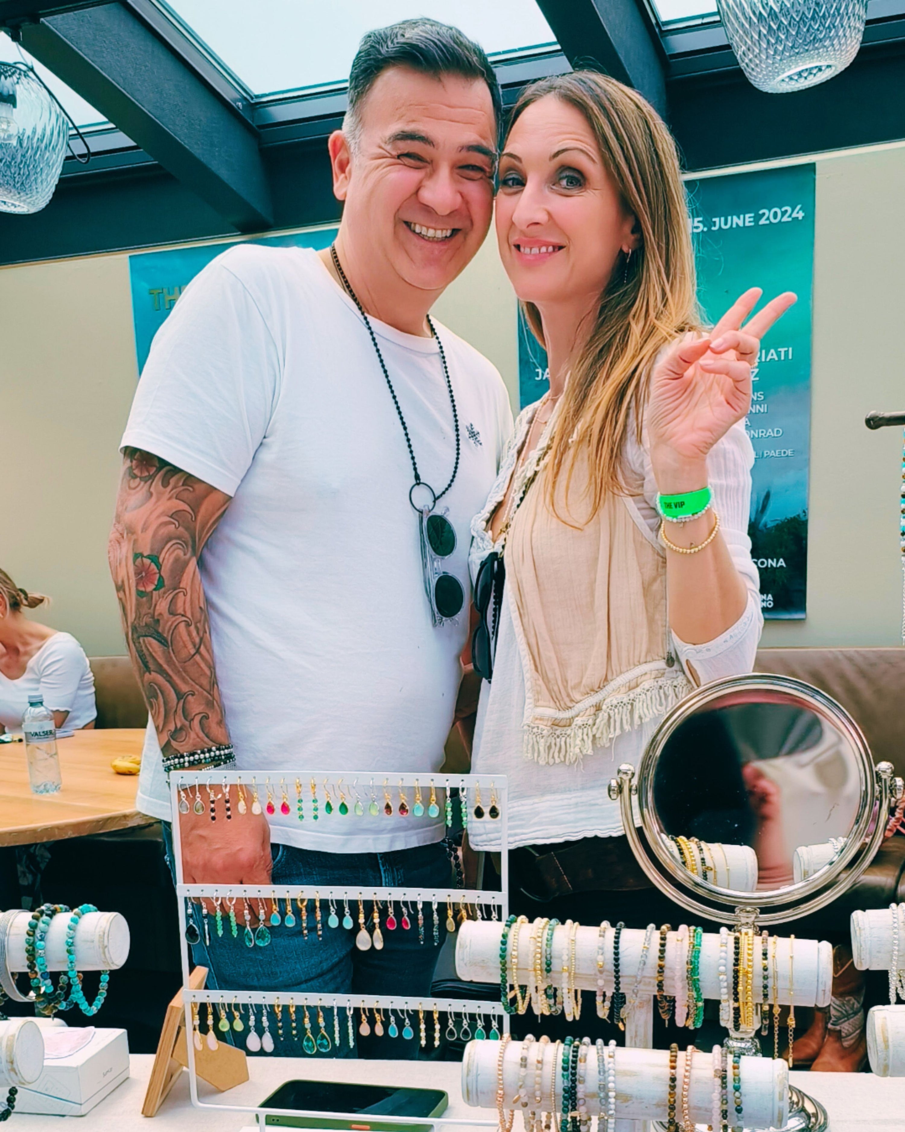 We continue with jewellery inspired by Bali and pre-Columbia. There are the most beautifulgemstones and carefully crafted precious metals from Balibay, Rhoncus and Acesup, as well as necklaces, bracelets and pendants. Eyewear necklaces are the big hit of the season. Even I can't keepmy hands off the Balibay eyewear chains and buy myself one made of fine rose silver. Rhoncus also runs the friendly GLITZERLIEBE stand, where party guests can get glitter on their faces for a tip.