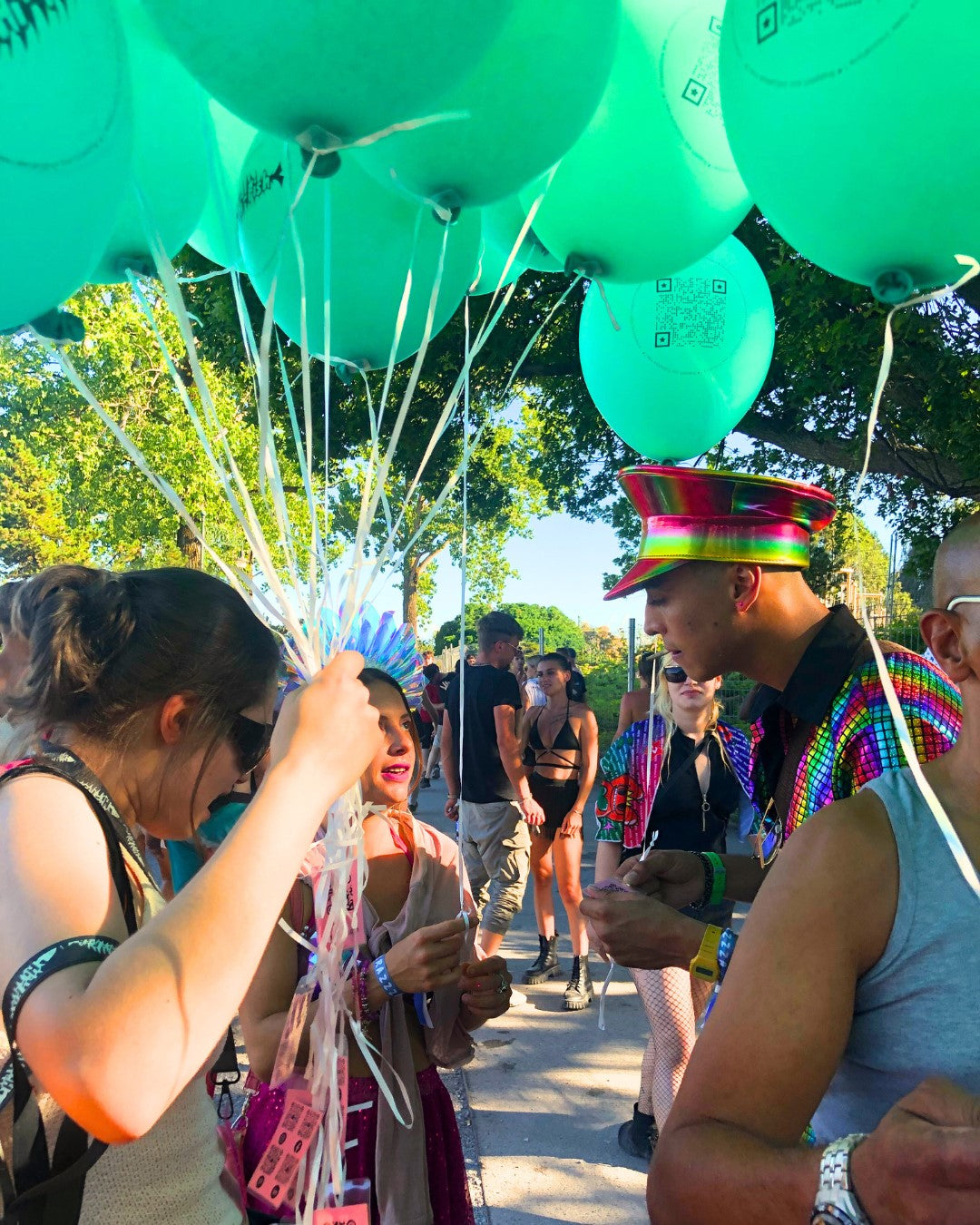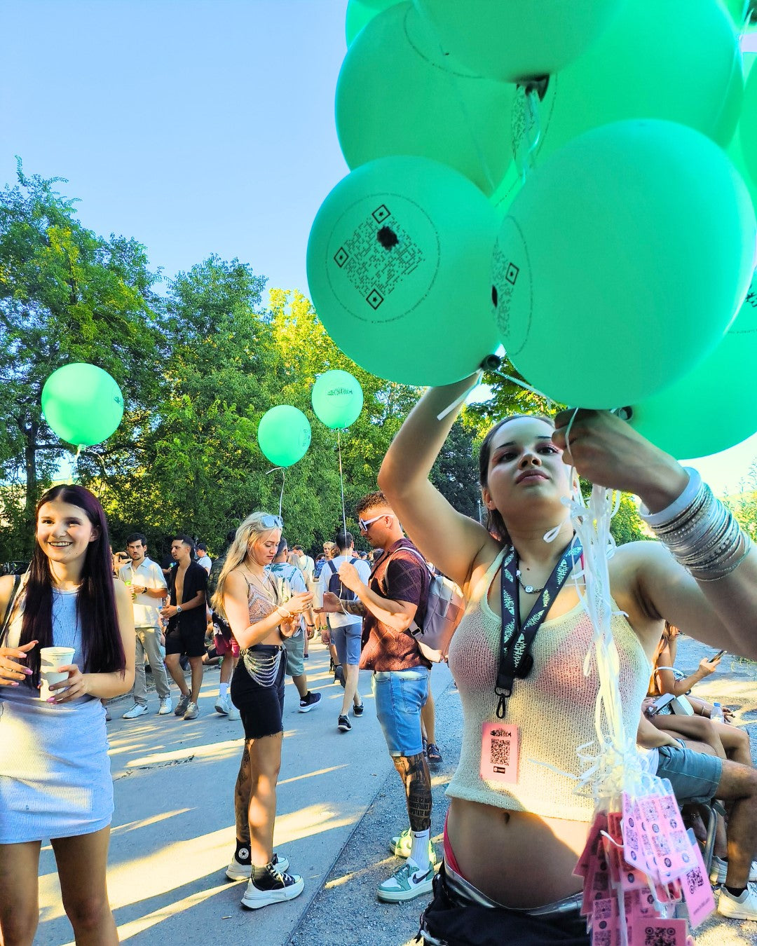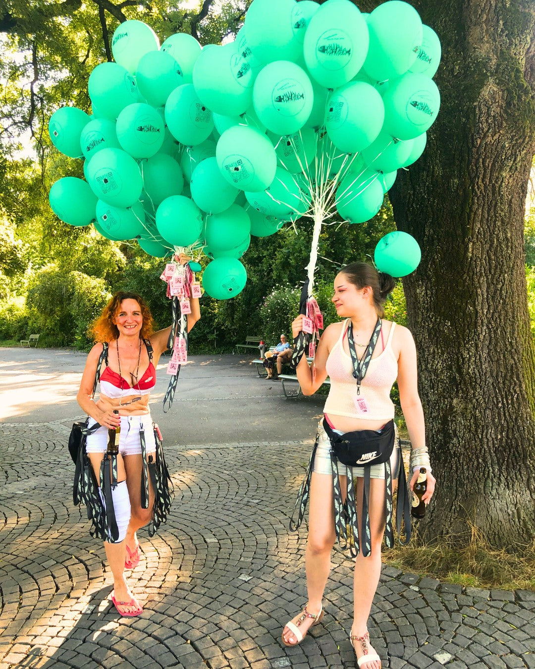 It's Street Parade time in Zurich and the weather and the mood of the ravers couldn't be better. With daughter Jana and friend Maja, we make our way to the lakeside promenade - with 121 balloons in tow! But the wind plays its game with the balloons and twists the ribbons into big knots. No matter.
